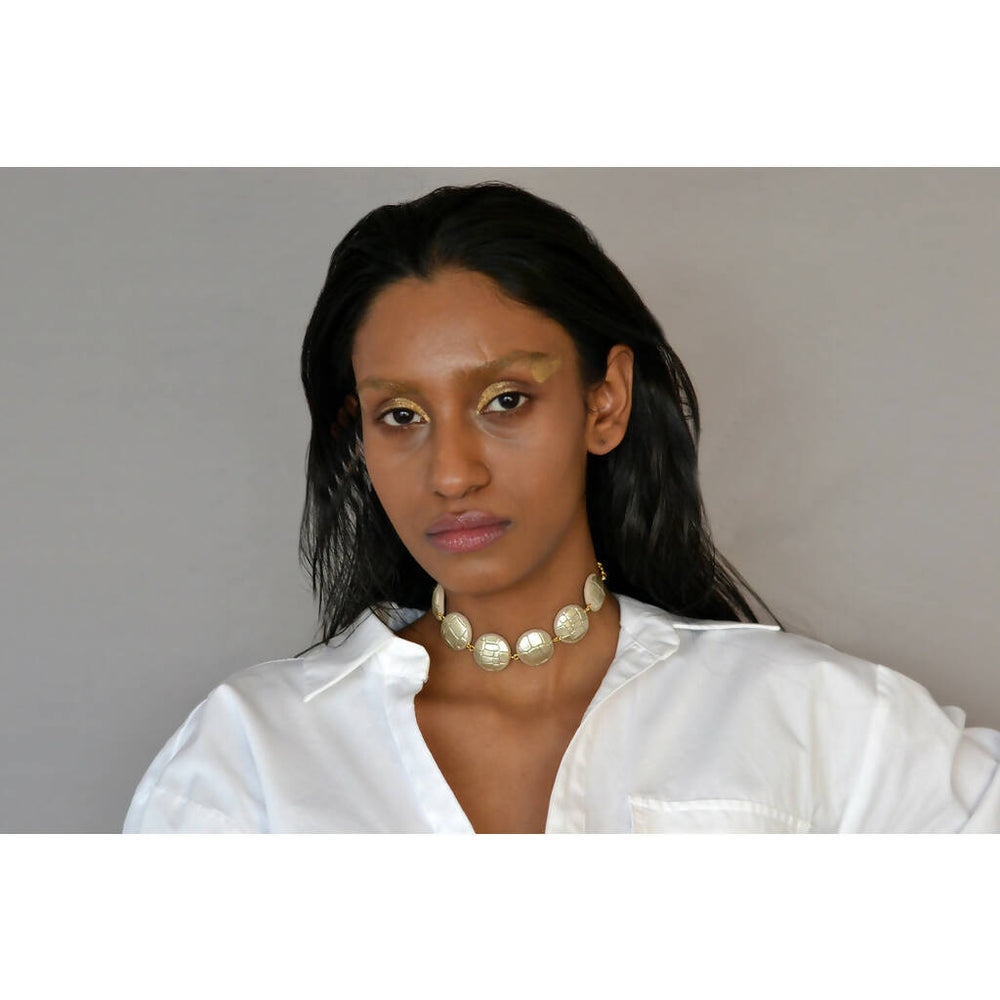 Wear it as a choker or unclip and style it as a bracelet! The Coin choker in champagne gold with an embossed croco effect can be styled alone or even layered with dainty gold chains.