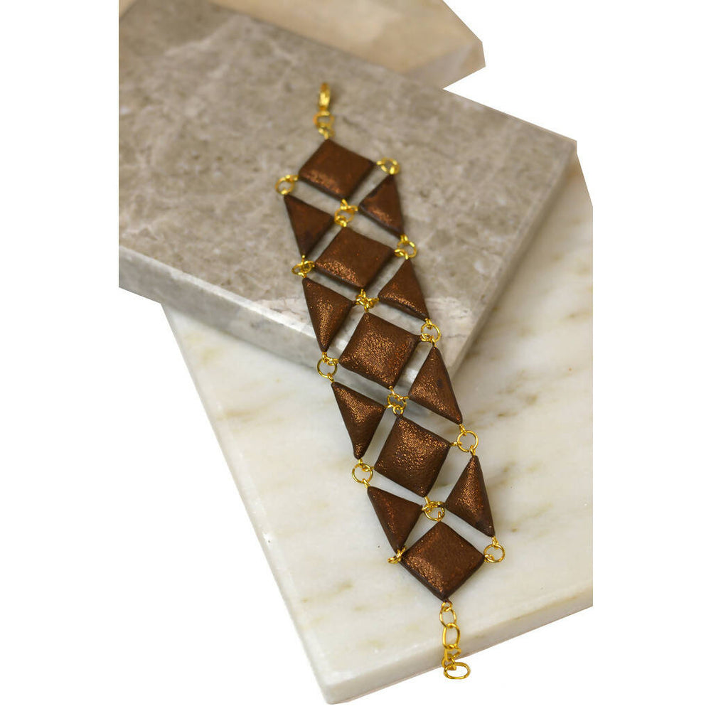 Geometric leather pieces put together with gold-plated fittings and rings in shimmery brown leather, the diamond bracelet is your perfect night-out accessory.