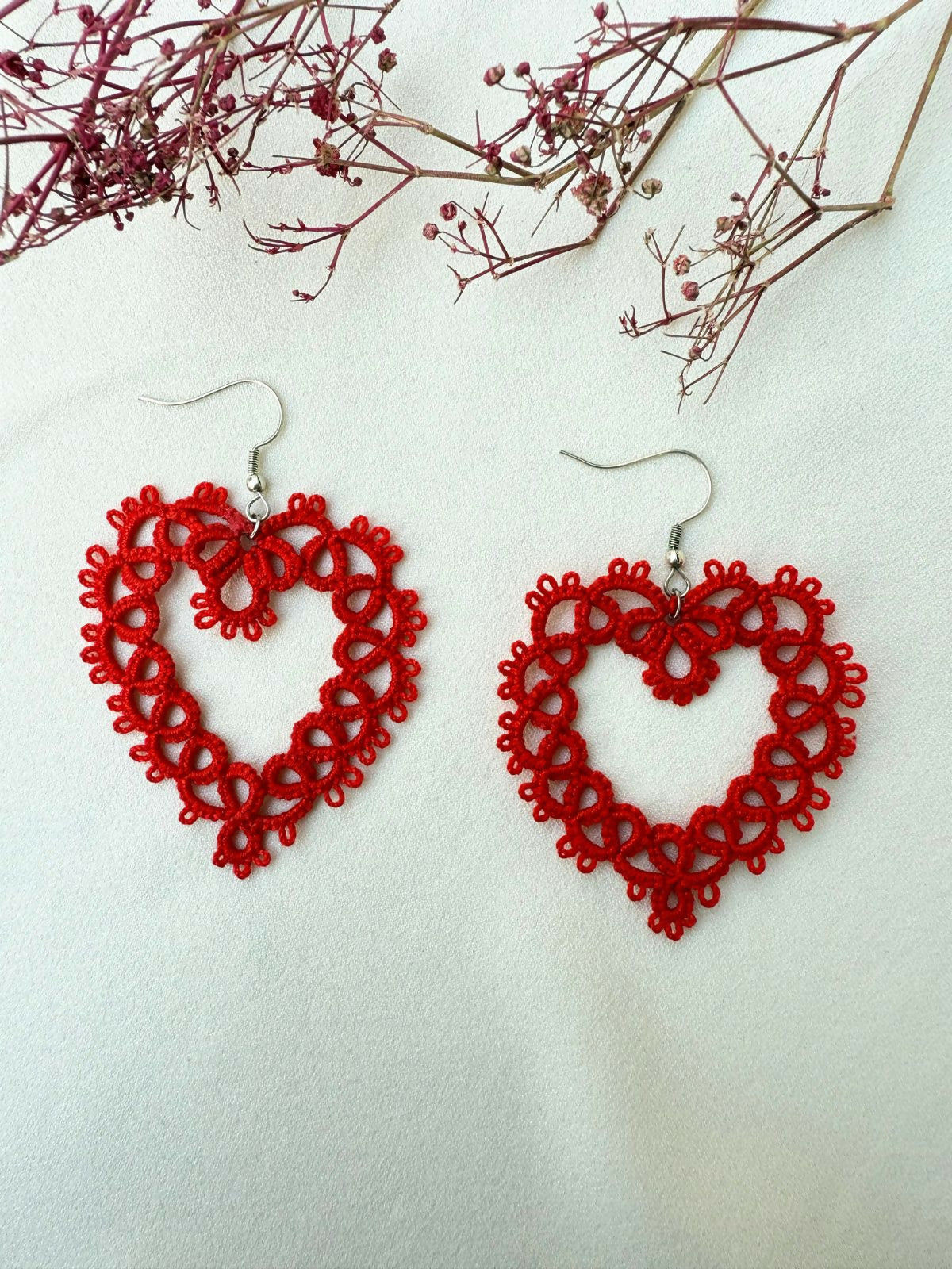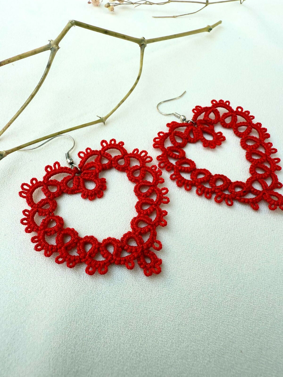 • Lovingly handcrafted using the timeless shuttle tatting technique, the flaming heart earrings showcase delicate lacework made from cotton thread, each stitch a symbol of artistry and care.