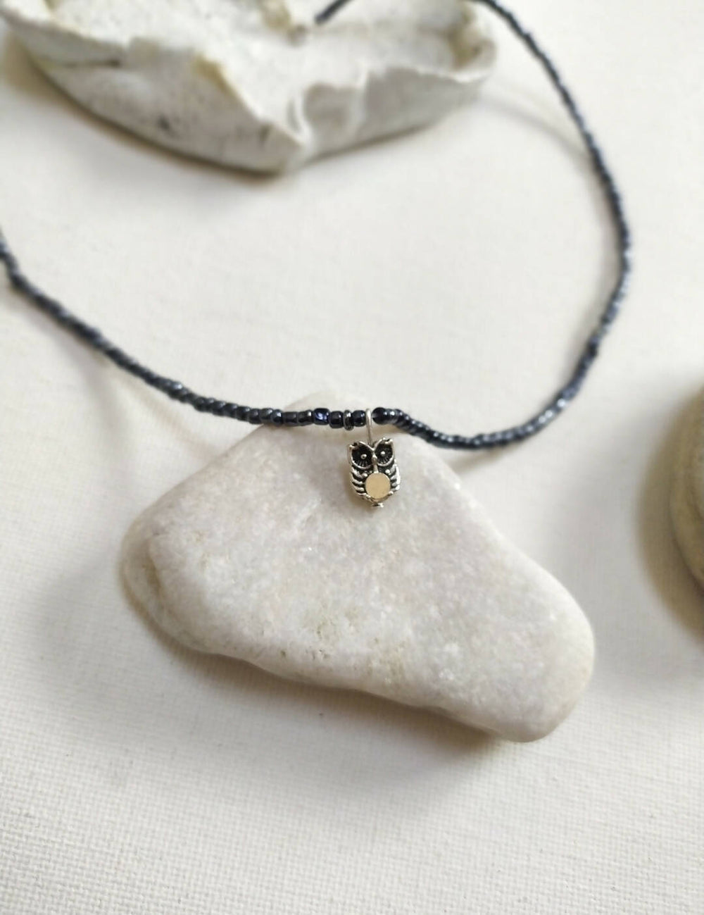 Our Owl Charm Necklace is upcycled using broken/leftover beads.