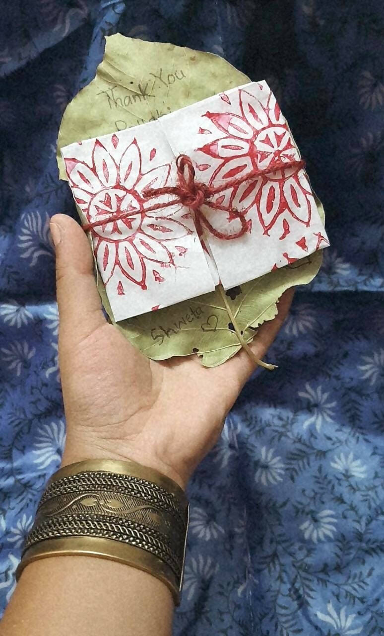 The idea of packaging is to create minimal impact on our environment and to promote the process of upcycling and recycling. Every "Kauseyah" order comes in a zero waste potli bag or inside the brown paper with a customized message on the Sal leaves which are sourced from the forests of Bastar.