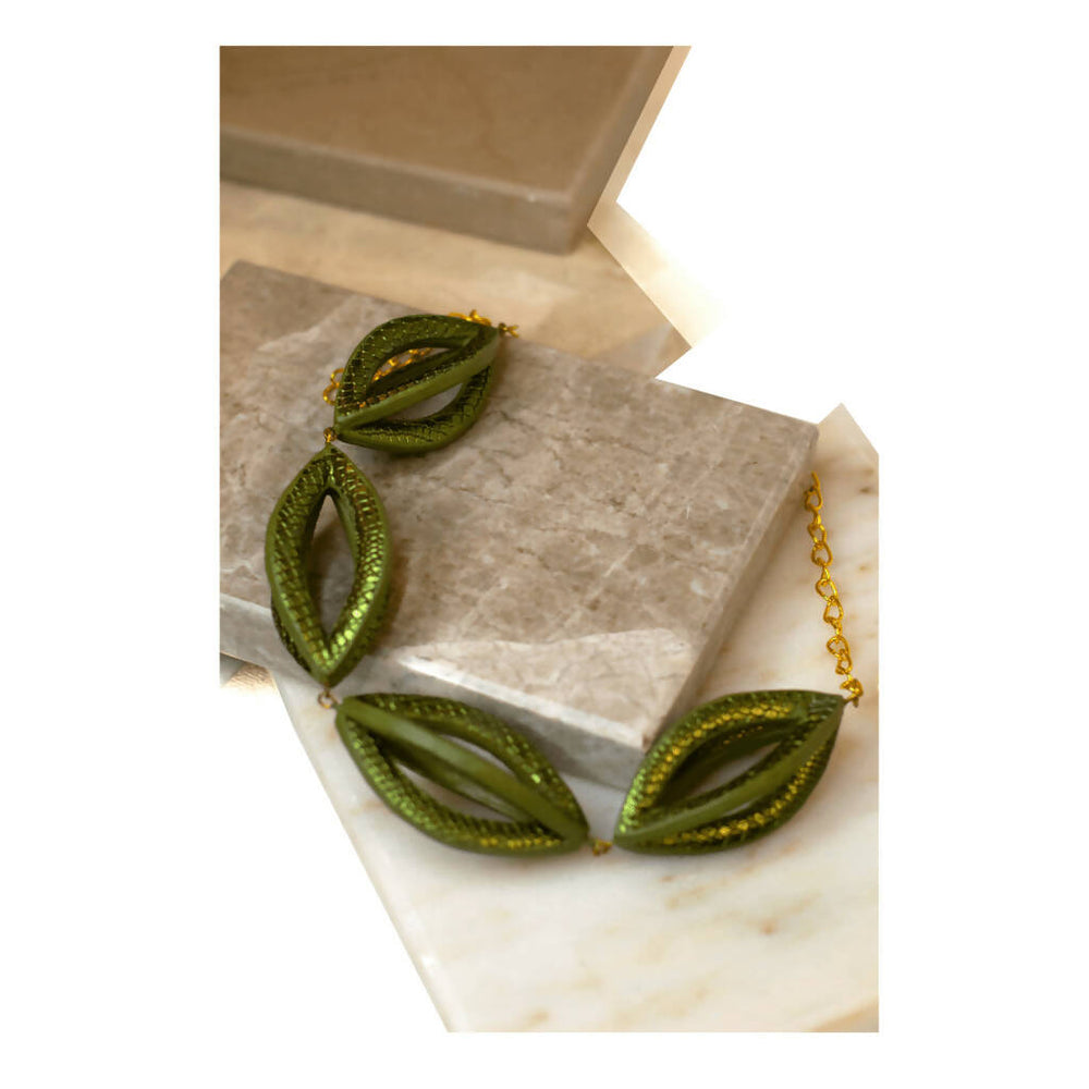 Metallic snake print leather, handcrafted into a prism-like shape. The neckpiece is a statement, one-of-a-kind piece.