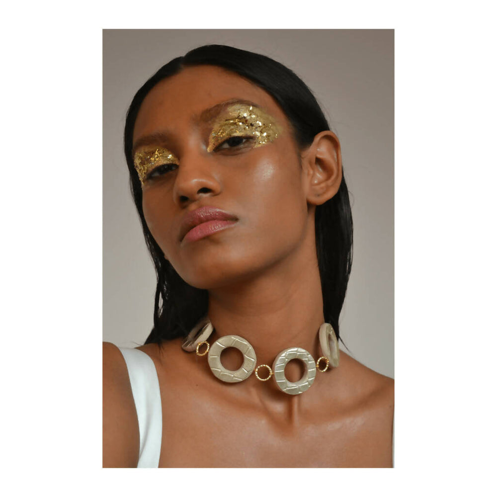 A reversible choker with champagne gold, croco embossed leather on one side, and beige suede with a patchy silver foil on. The back chain and hooks are gold-plated on brass.