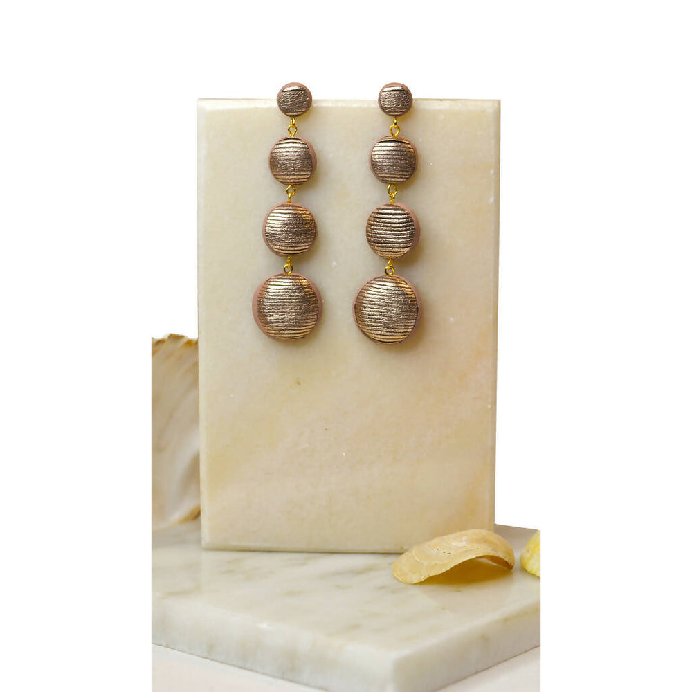 The scallop danglers are handcrafted in rose gold foiled leather with delicate cuts on the surface. The pieces are given a beautiful round to reflect the shine and make you stand out! The earrings are a perfect statement piece, worn from day to night and also with an Indian ensemble.