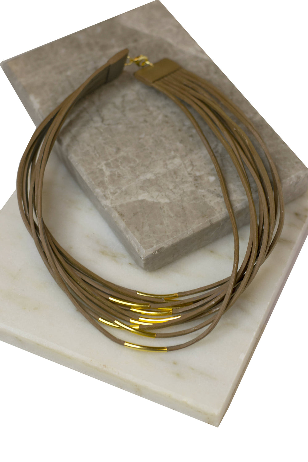 A two-way string choker with gold leather on one side and silver on the other with gold plated brass fittings, that fall asymmetrically once you wear the choker. Reverse it on either side and layer it with your other accessories or simply twist it for a mixed metal look.
