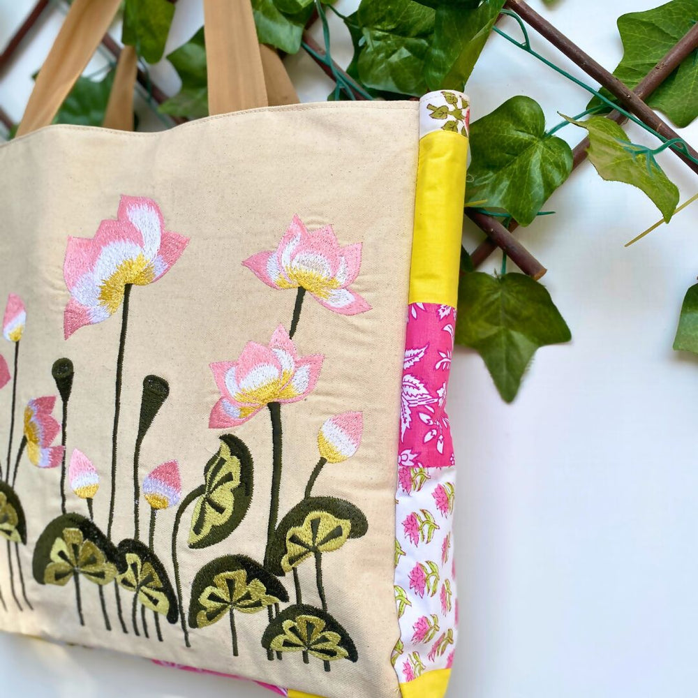 • It is a beautiful canvas tote bag with an embroidered lotus design making it a must-buy tote bag.