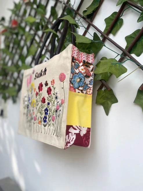 - The Floral Cascade Box Tote Bag is a stunning canvas accessory, featuring a vibrant floral design that combines both hand and machine embroidery at the front. This intricate detailing brings the bag to life, making it a standout piece for any occasion.