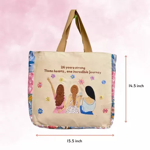 - The Friendship Tote Bag is a heartwarming and stylish accessory, beautifully crafted from canvas and featuring a charming embroidery design of three friends at the front, making it the perfect gift to celebrate friendship and love.