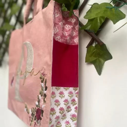 - The canvas peach box tote bag is a stunning accessory, featuring a vibrant floral embroidered design at the front, personalized with a name, and complemented by intricate patchwork detailing along the sides, making it a must-have for those who appreciate both beauty and uniqueness.