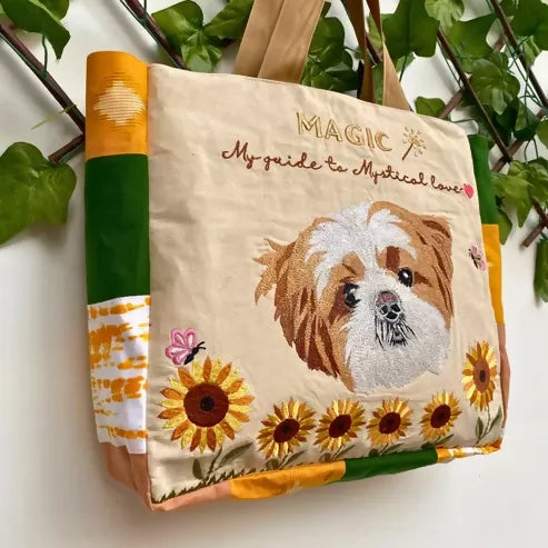 - The Personalized Pet Dog Tote Bag is a delightful and unique accessory, featuring a vibrant floral design that blends hand and machine embroidery at the front, with patchwork detailing along the sides and back, making it a must-have for pet lovers and fashion enthusiasts alike.