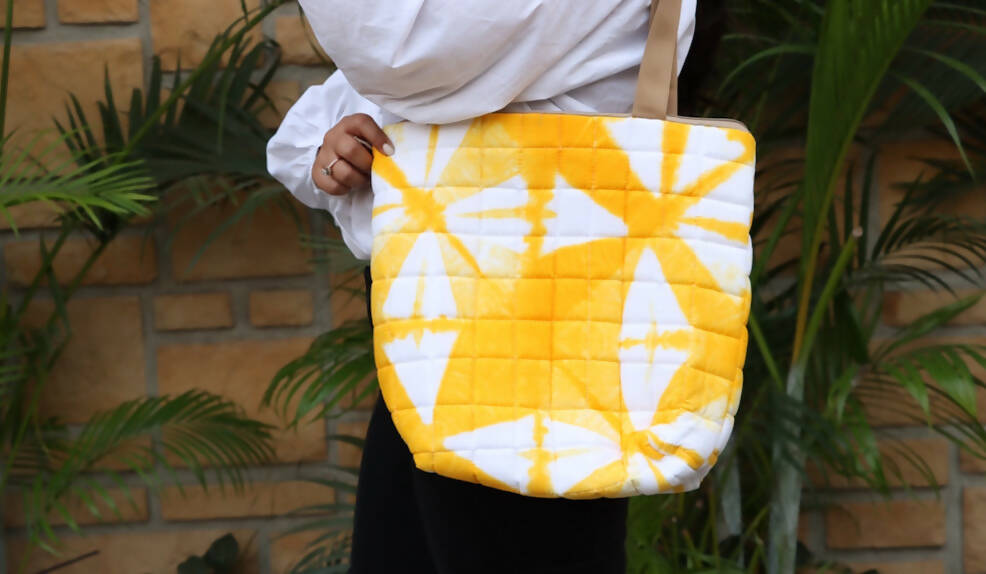 - Carry sunshine wherever you go with our Yellow Tie-Dye Quilted Tote, a burst of cheerful style and versatile functionality.