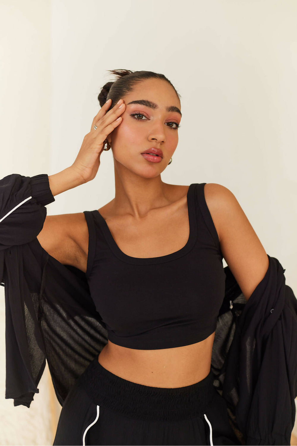 - Pair this U-neck cropped knit top with high-waisted wide-leg trousers and statement earrings for a trendy and relaxed yet polished look.