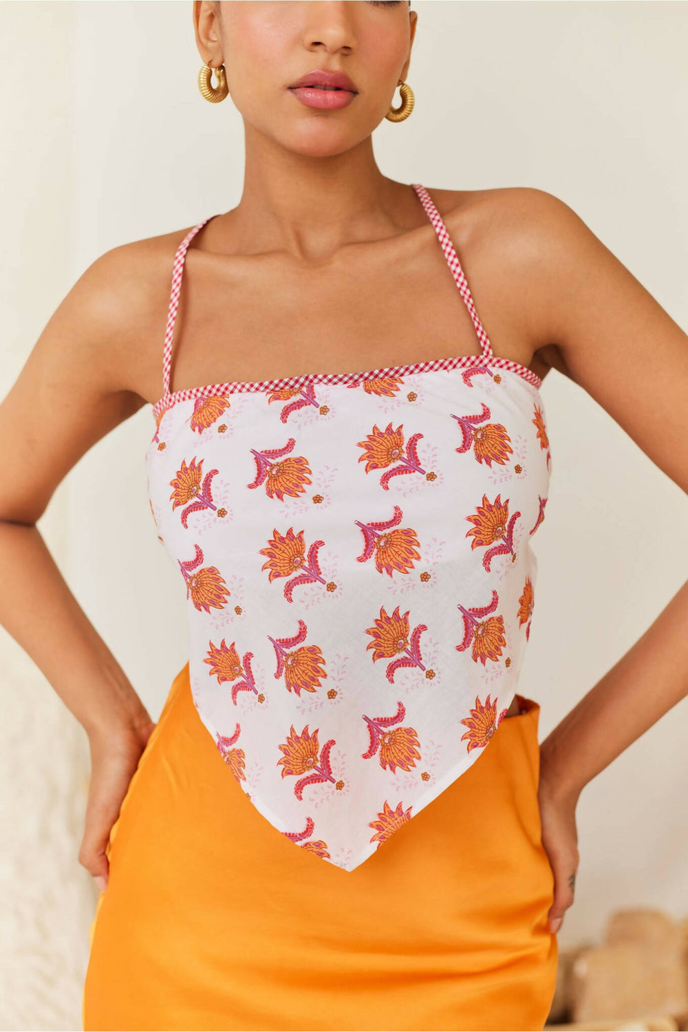 - This cotton scarf top showcases thin adjustable straps with a criss-cross detail at the back.