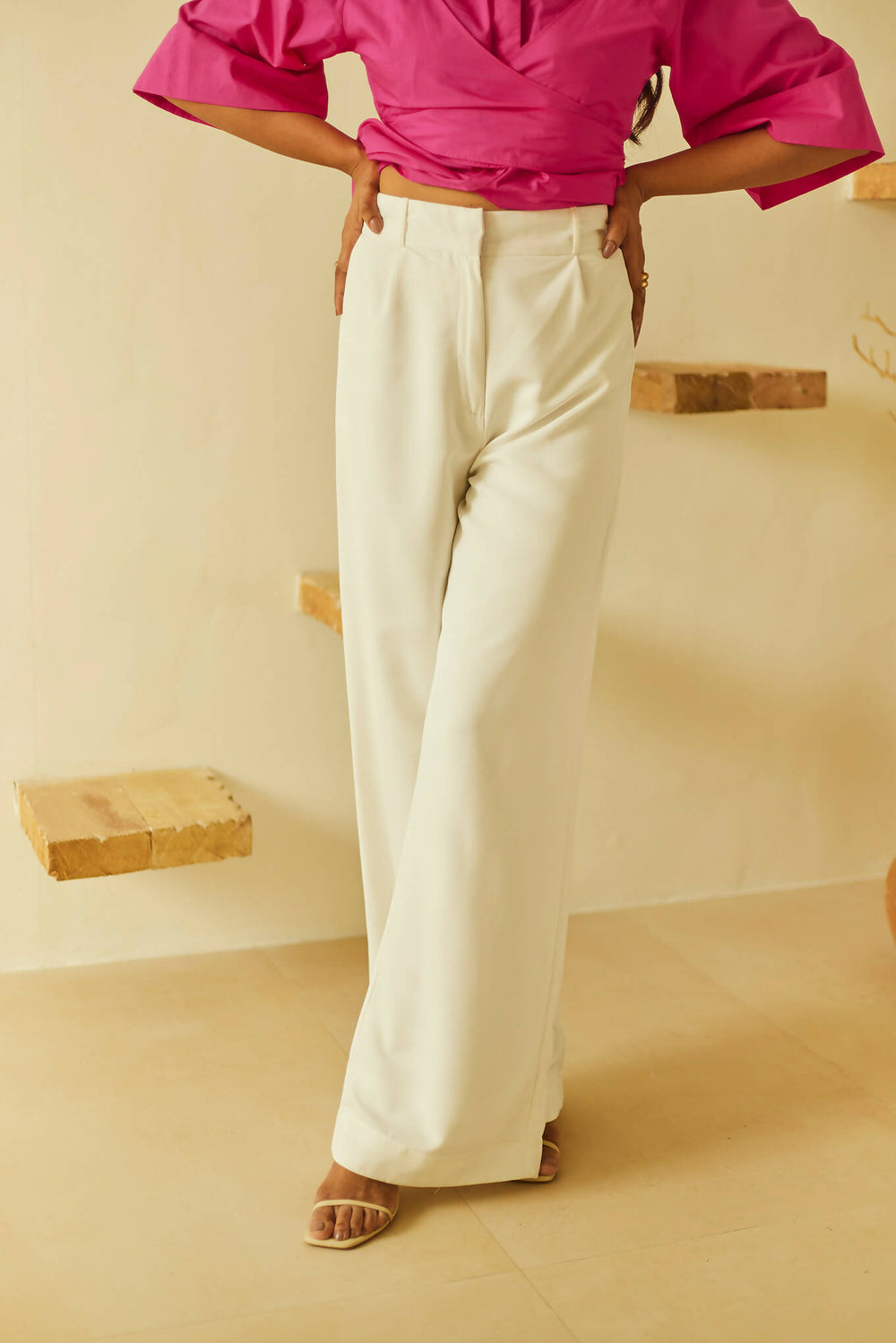 - Pair these high-waisted wide-leg pants with a tucked-in fitted blouse or a tailored crop top to accentuate the waistline and highlight the elegant pleat details.