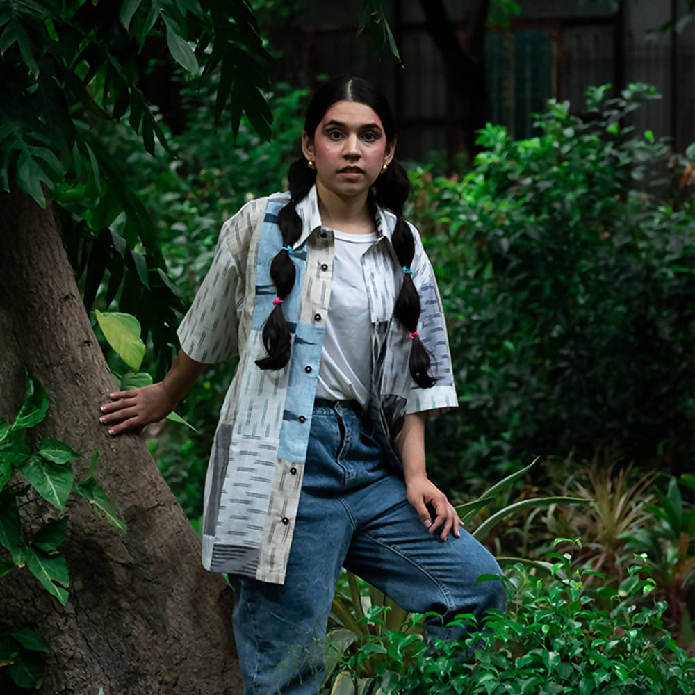 Boxy fit upcycled ikkat shirt in post-production scraps.