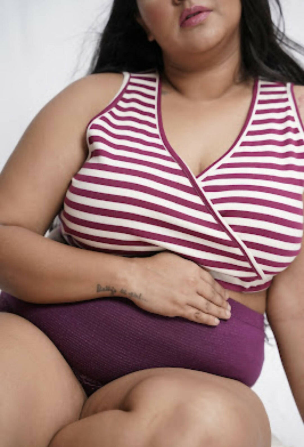 - Embrace fuss-free fashion with a chic plum and white stripe print on this nursing bra, featuring a wrap cut for easy wear.
