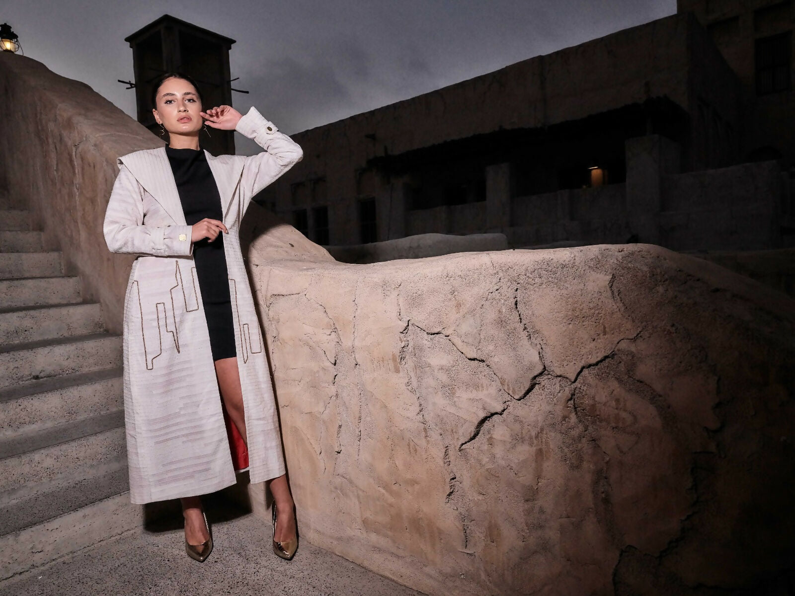• Striking sequin Dubai skyline detailing paired with a dramatic lapel embellished with the word ‘Future’.