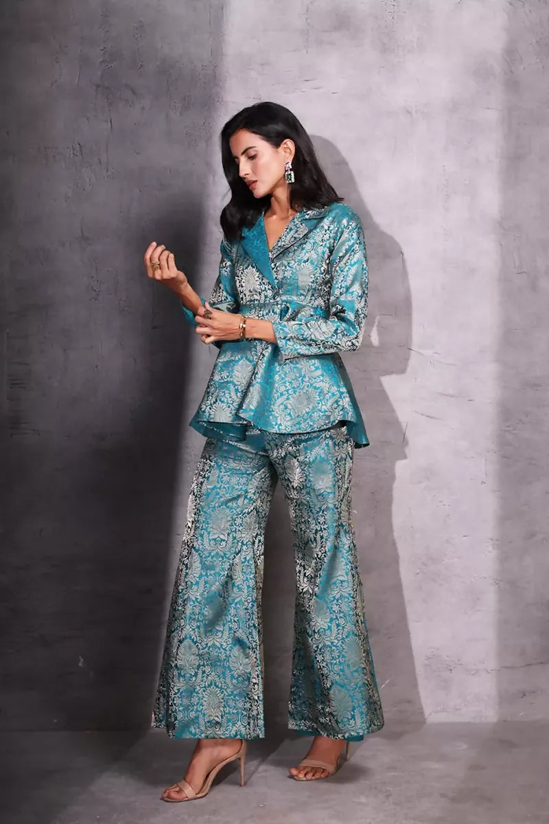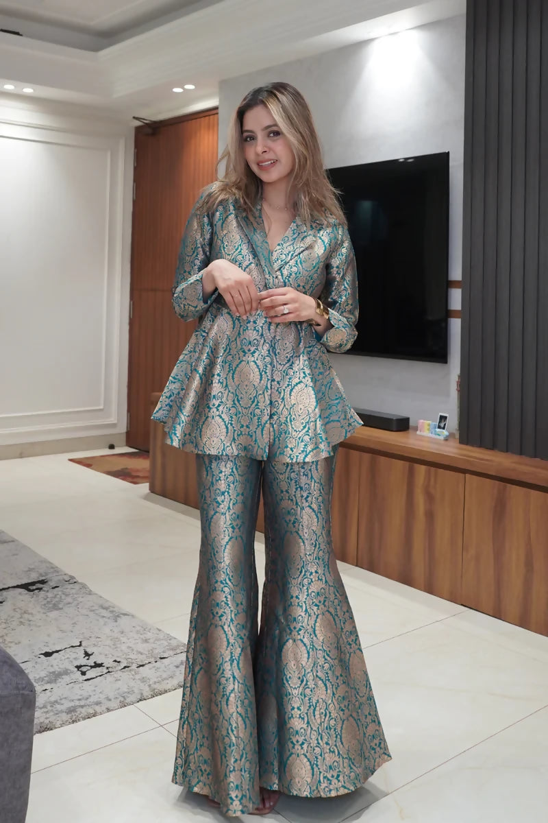 - Elevate your wedding season wardrobe with this stunning ensemble featuring intricately designed brocade flared pants paired with a stylish peplum top.