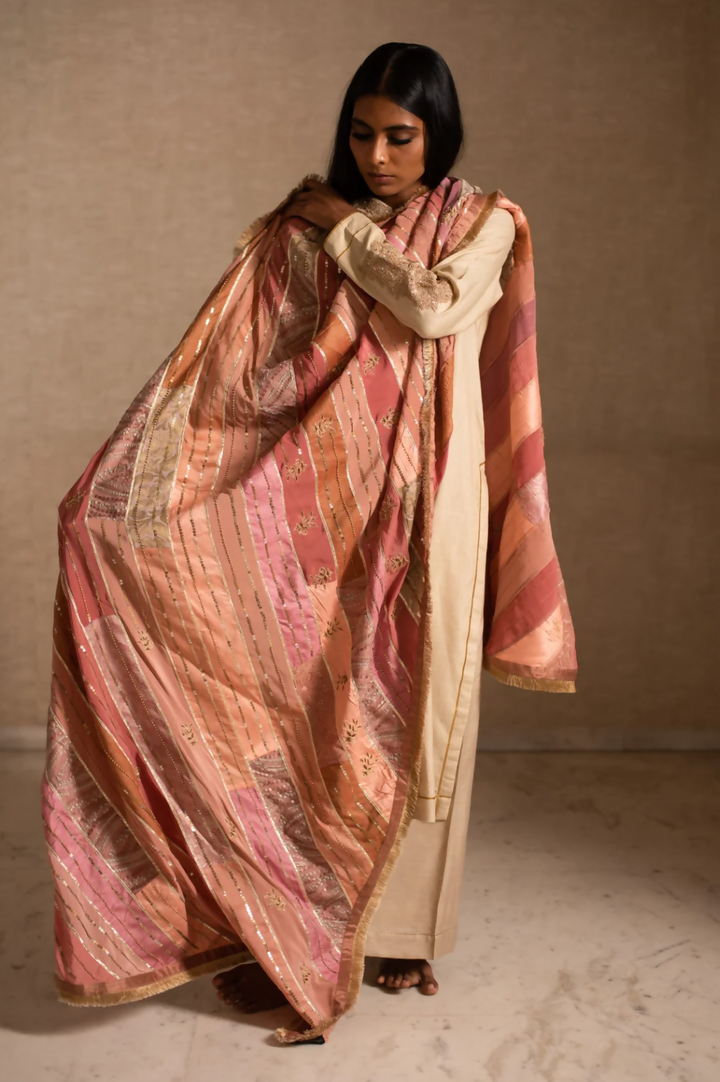 • This intricately embroidered dupatta with zardozi and gota is elegantly bordered by handwoven silk and kiran. It is crafted from materials sourced from post industrial surplus materials.