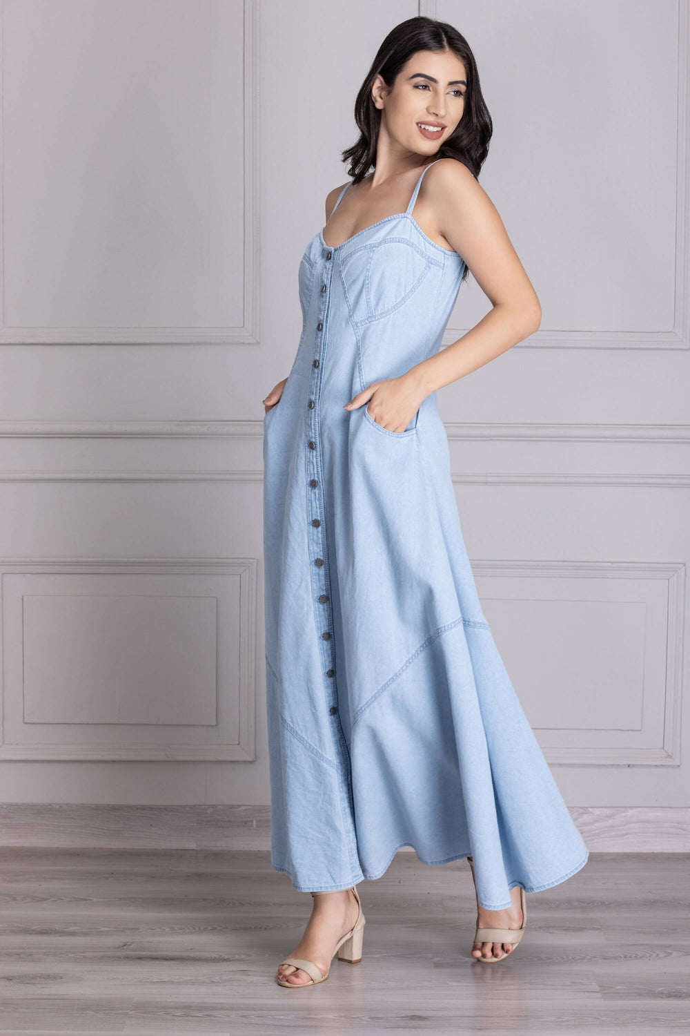 - This sleeveless Denim Dress is all about that bright and breezy summer touch. Crafted from soft denim and dotted with sunny-day style. The fitted body underlines a running neckline and a neat contemporary look.