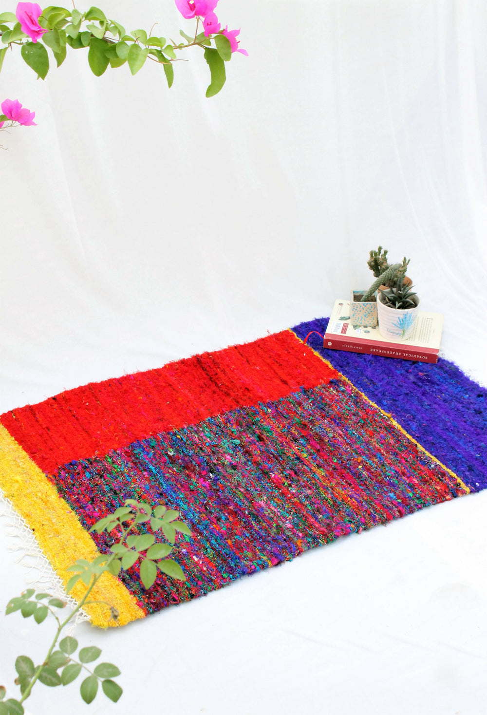 Made up of upcycled silk yarns and cotton in vibrant colors, the dhurrie is a fresh take on traditional handwoven 'panja dhurrie'