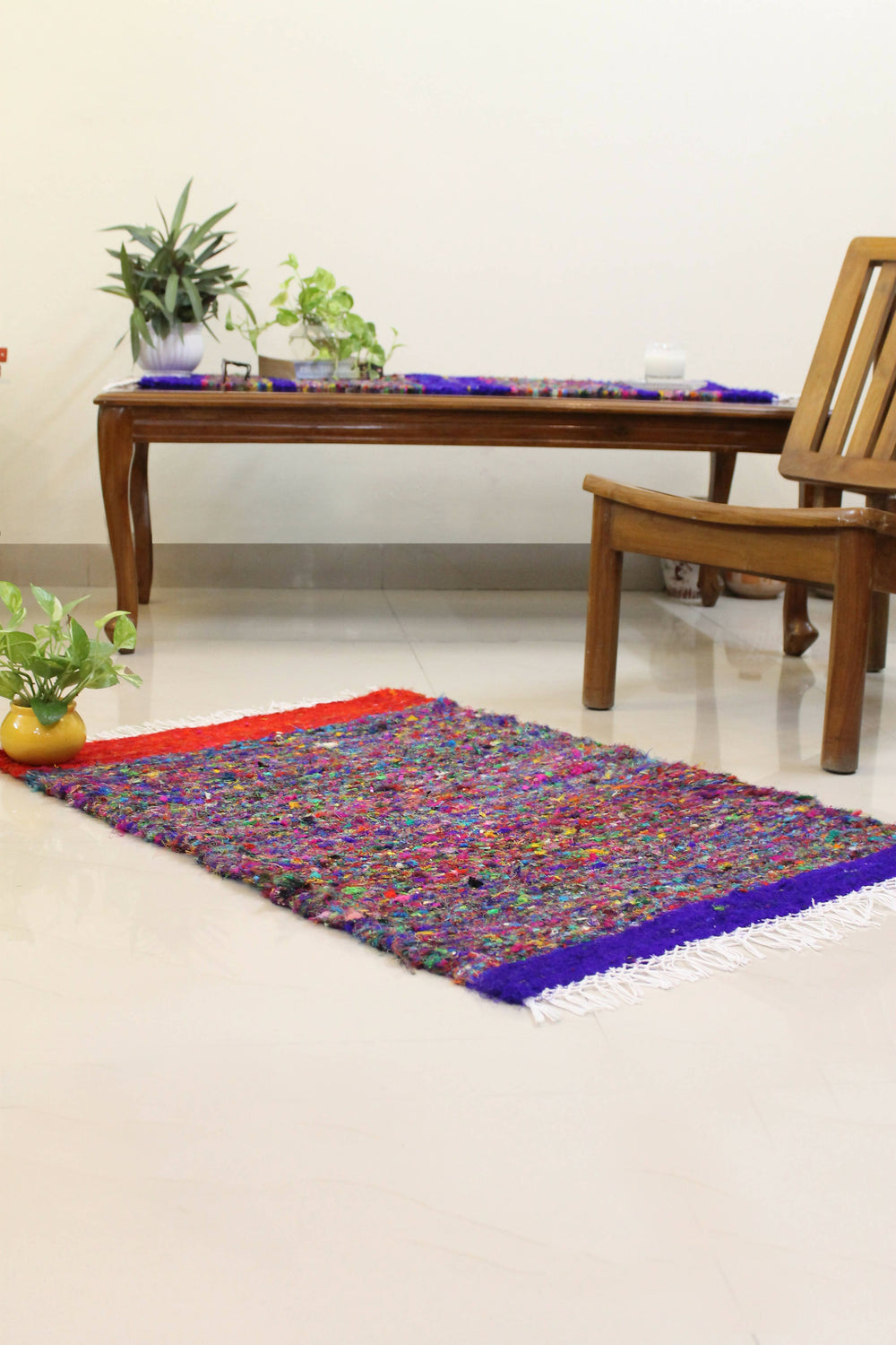 The dhurrie runner comes in a biodegradable courier pouch. The dhurrie comes wrapped in repurposed paper tied with jute yarn.