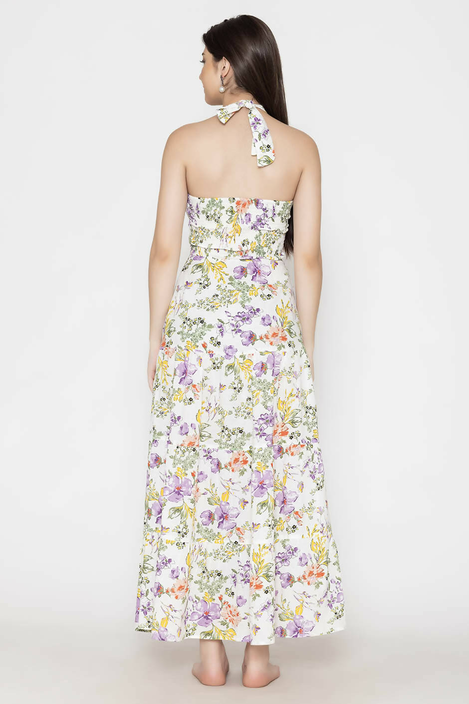 - Embrace pure elegance in our white halter neck floor-length dress, crafted from 100% cotton for a breezy, comfortable feel. Adorned with vibrant floral color prints throughout, this dress is a beautiful celebration of chic style.